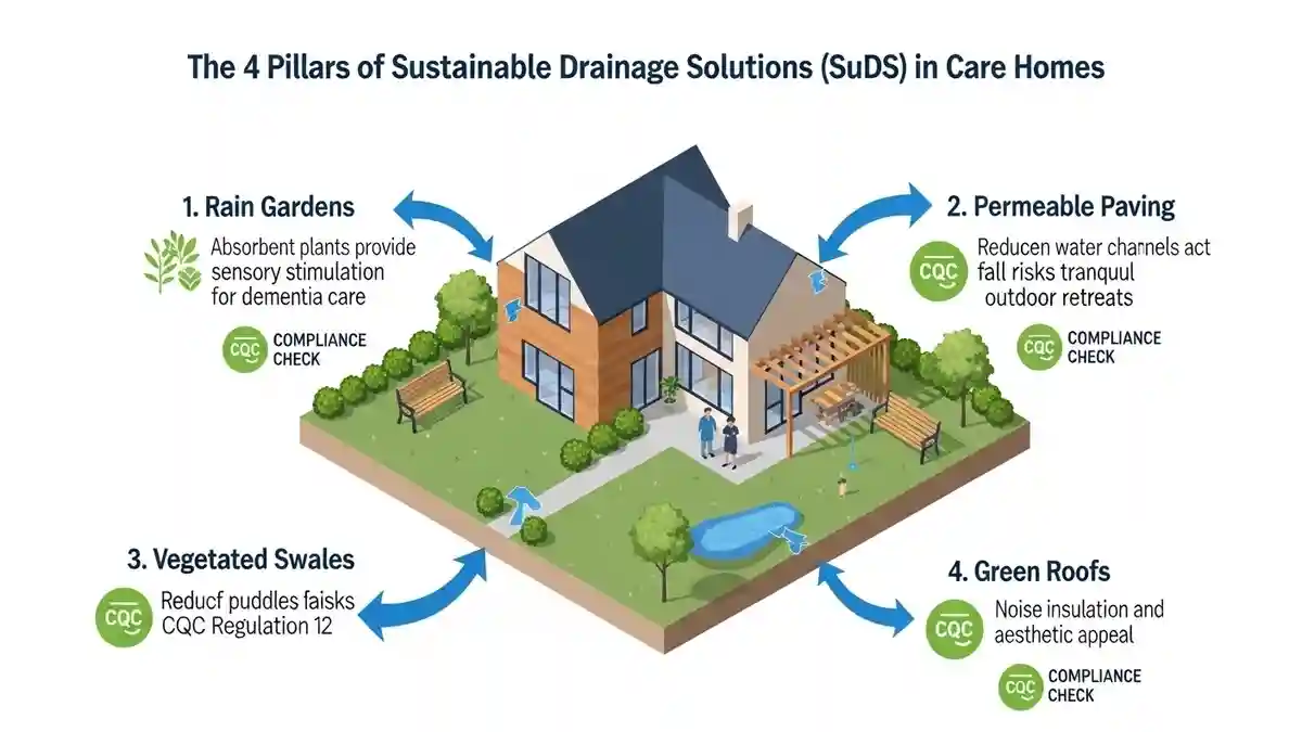 The future of sustainable drainage solutions CQC care home design is the integration of SuDS (Sustainable Drainage Systems). In Windleshamt, Policy EN18 of the Local Plan encourages SuDS to manage surface water runoff, which often plagues the surrounding area.